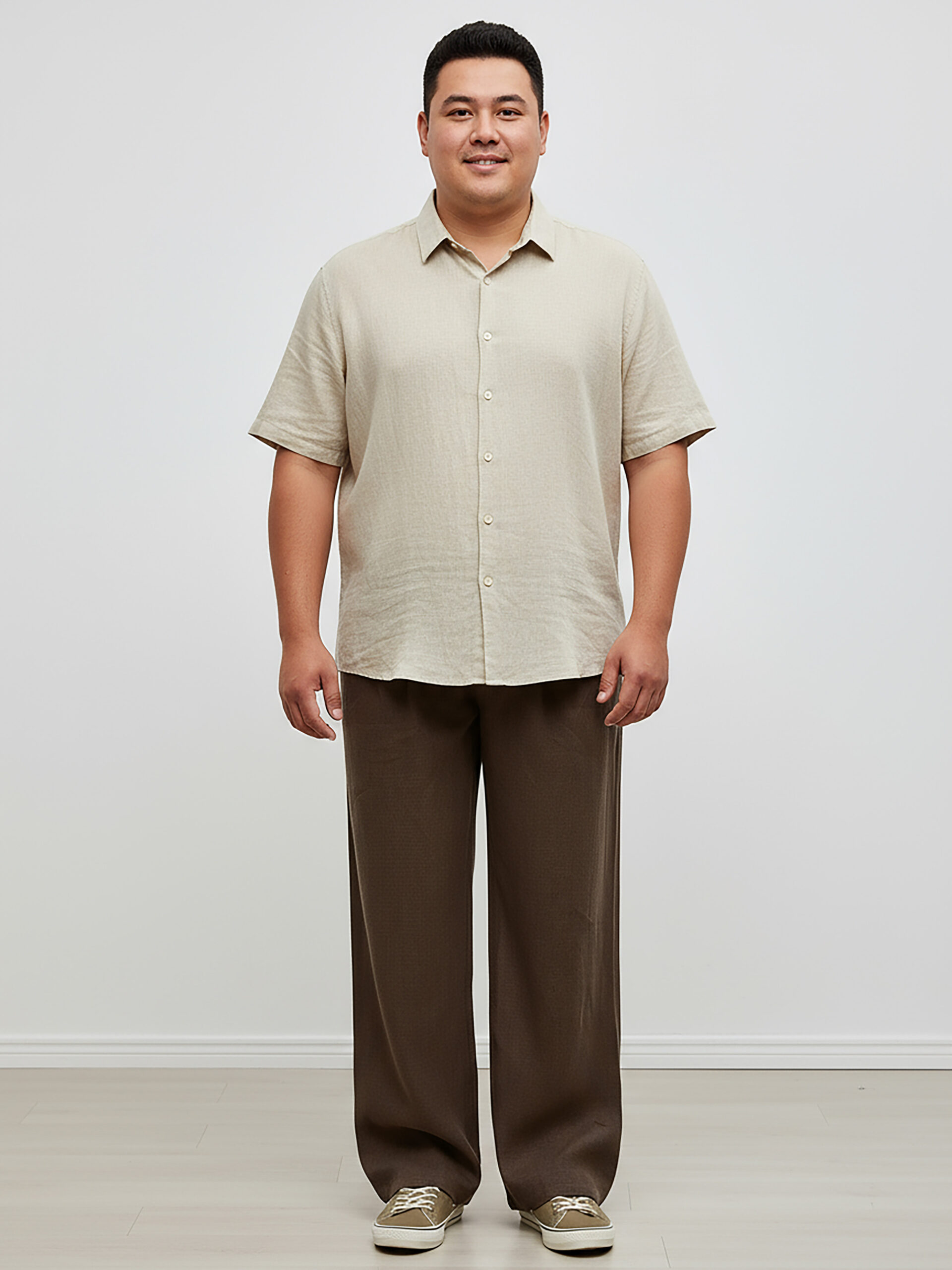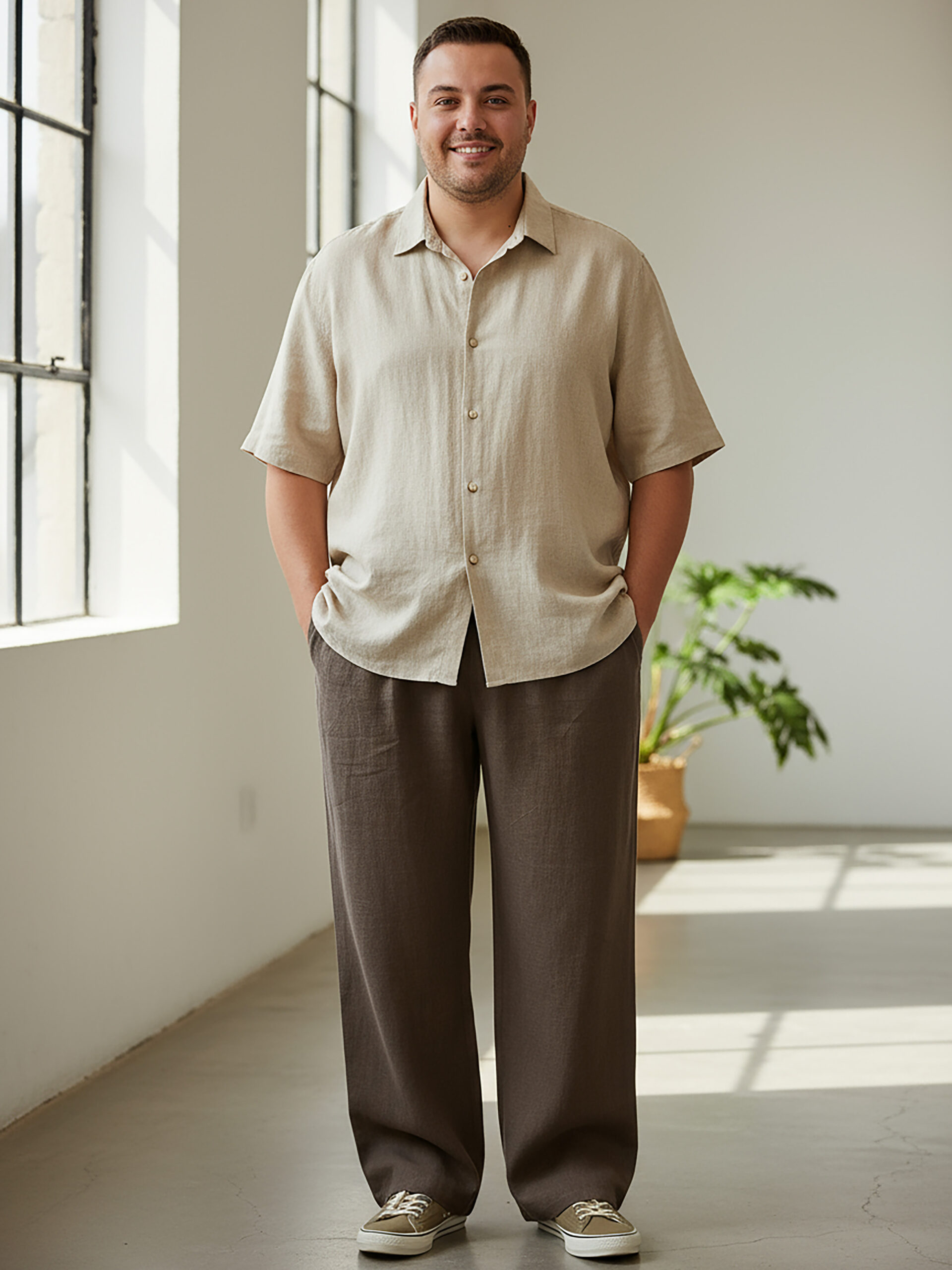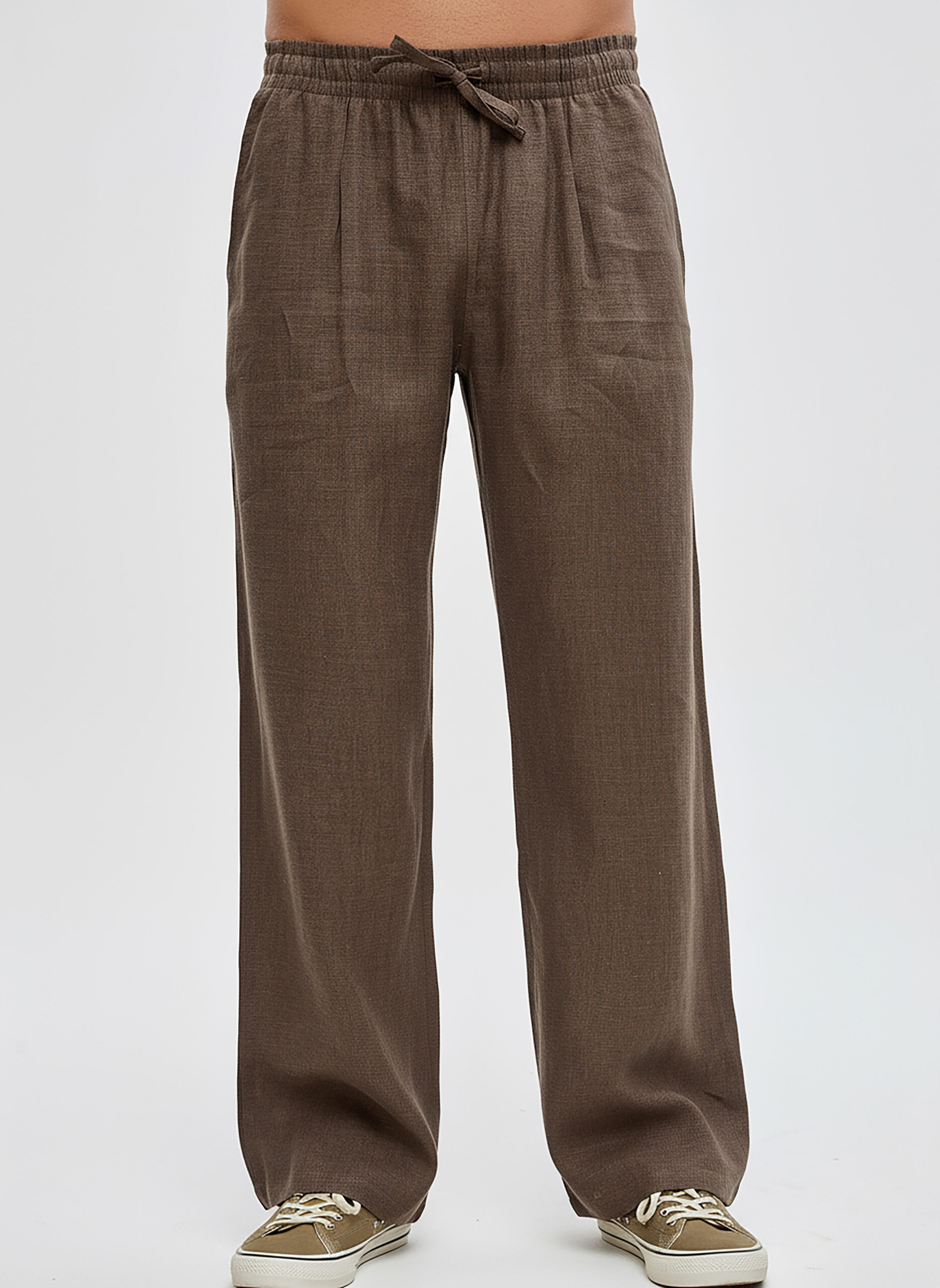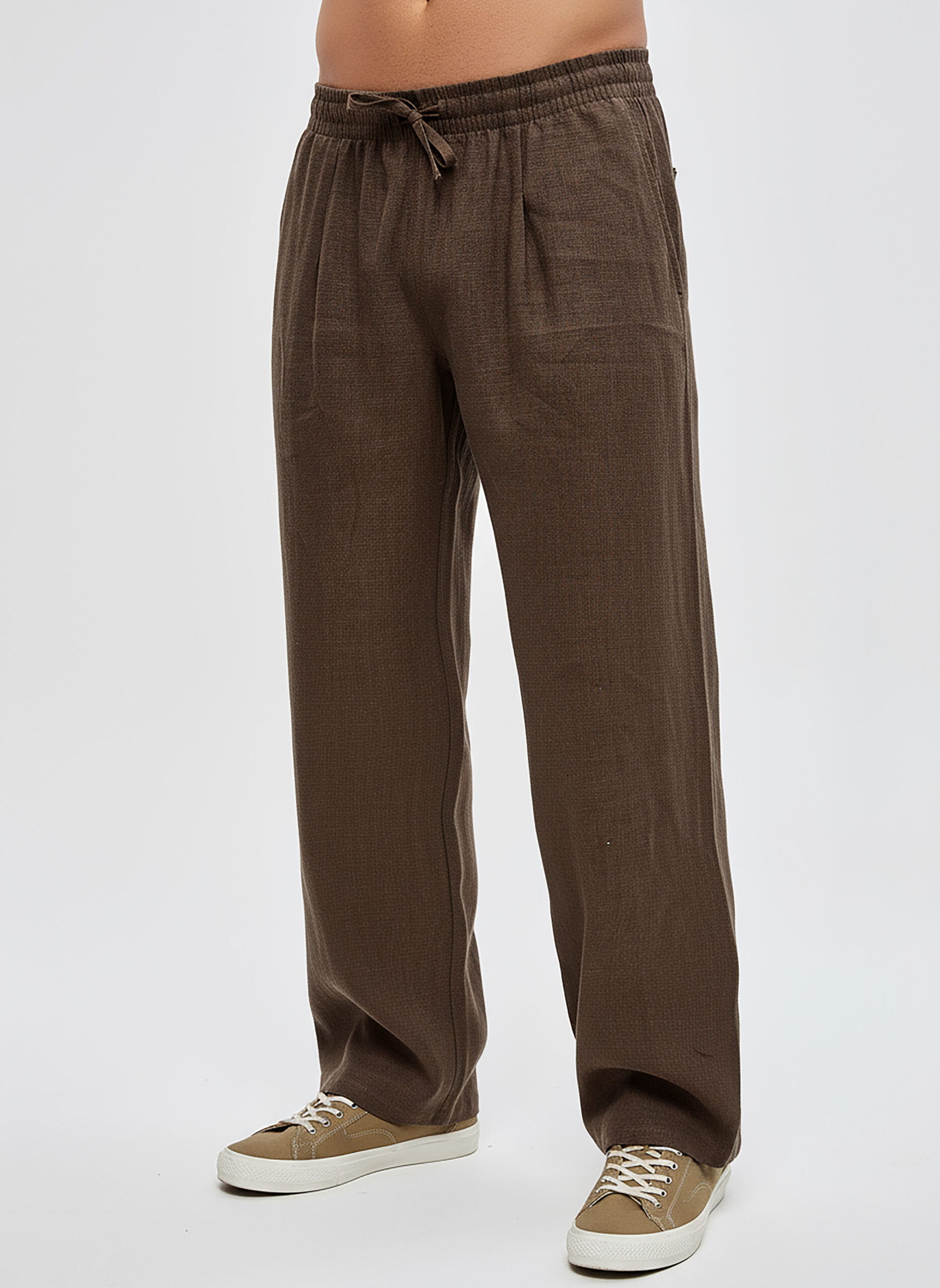 Свободные мужские брюки – палаццо широкого кроя темно-бежевый цвета выполнены из 100% льна. Брюки мужские льняные имеют классическую среднюю посадку по талии, глубокие удобные боковые карманы , широкий эластичный пояс-резинку с льняным пояском для завязывания, два накладных кармана сзади. Брюки лен мужские широкие обладают антисептическими свойствами , хорошо впитывают влагу и быстро отдают её – высыхают, в жару работают как кондиционер, снижая температуру на поверхности тела на несколько градусов, хорошо отражают солнечные лучи, задерживая ультрафиолет. Брюки мужские льняные на резинке прекрасно сохраняются, хорошо переносят температурные перепады и самые жесткие стирки. Штаны мужские изо льна станут вашей любимой вещью и прослужат долго. Однотонные льняные брюки станут идеальной летней базой: их можно надеть в офис, на ежедневные прогулки, поездки за город, отдых на море. Для удобства наших покупателей мы подготовили размерную сетку, она находится вместе с фотографиями изделия (листайте фото и увидите). Широкий размерный ряд (от маленьких до больших размеров) позволяет подобрать пляжные брюки для мужчин разного типа телосложения. Модель предусматривает большие размеры и подойдет для высоких и невысоких. Сочетай брюки с льняной рубашкой из комплекта или со своим любимым верхом и создавай комфортные и стильные аутфиты по любому поводу и на любой сезон. За счет легкой и дышащей ткани идеально подойдут на теплое время года. Возьми дышащие льняные штаны с собой в отпуск для создания спокойных сдержанных образов.