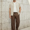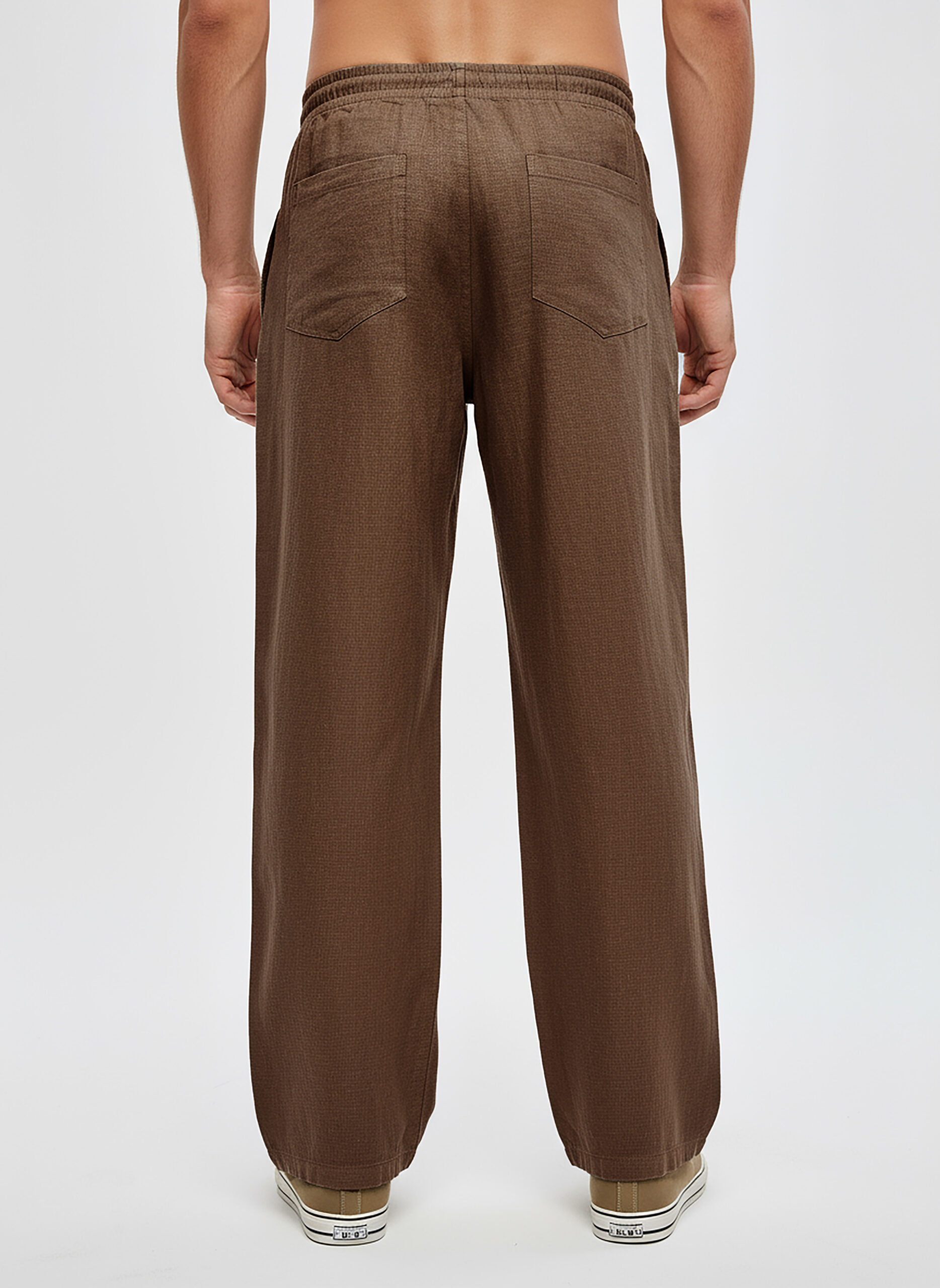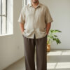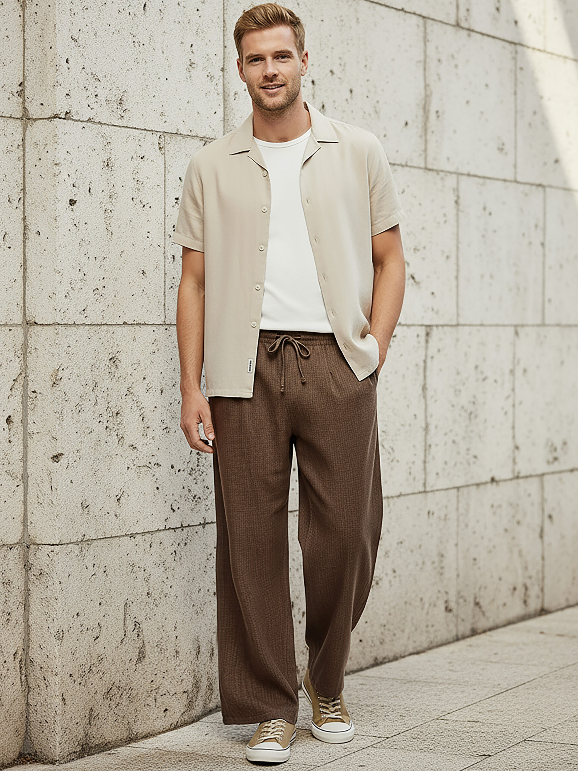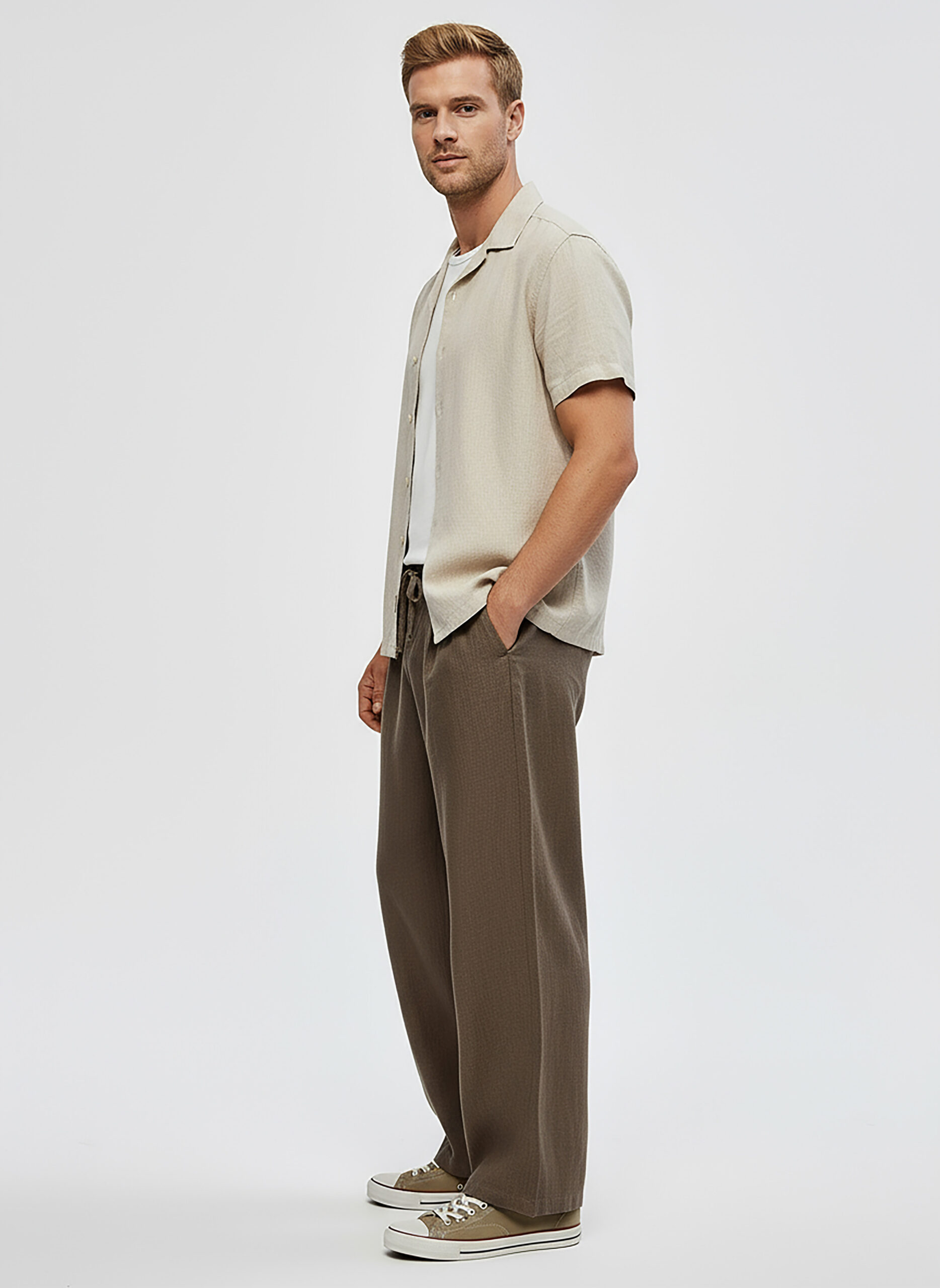 Свободные мужские брюки – палаццо широкого кроя темно-бежевый цвета выполнены из 100% льна. Брюки мужские льняные имеют классическую среднюю посадку по талии, глубокие удобные боковые карманы , широкий эластичный пояс-резинку с льняным пояском для завязывания, два накладных кармана сзади. Брюки лен мужские широкие обладают антисептическими свойствами , хорошо впитывают влагу и быстро отдают её – высыхают, в жару работают как кондиционер, снижая температуру на поверхности тела на несколько градусов, хорошо отражают солнечные лучи, задерживая ультрафиолет. Брюки мужские льняные на резинке прекрасно сохраняются, хорошо переносят температурные перепады и самые жесткие стирки. Штаны мужские изо льна станут вашей любимой вещью и прослужат долго. Однотонные льняные брюки станут идеальной летней базой: их можно надеть в офис, на ежедневные прогулки, поездки за город, отдых на море. Для удобства наших покупателей мы подготовили размерную сетку, она находится вместе с фотографиями изделия (листайте фото и увидите). Широкий размерный ряд (от маленьких до больших размеров) позволяет подобрать пляжные брюки для мужчин разного типа телосложения. Модель предусматривает большие размеры и подойдет для высоких и невысоких. Сочетай брюки с льняной рубашкой из комплекта или со своим любимым верхом и создавай комфортные и стильные аутфиты по любому поводу и на любой сезон. За счет легкой и дышащей ткани идеально подойдут на теплое время года. Возьми дышащие льняные штаны с собой в отпуск для создания спокойных сдержанных образов.