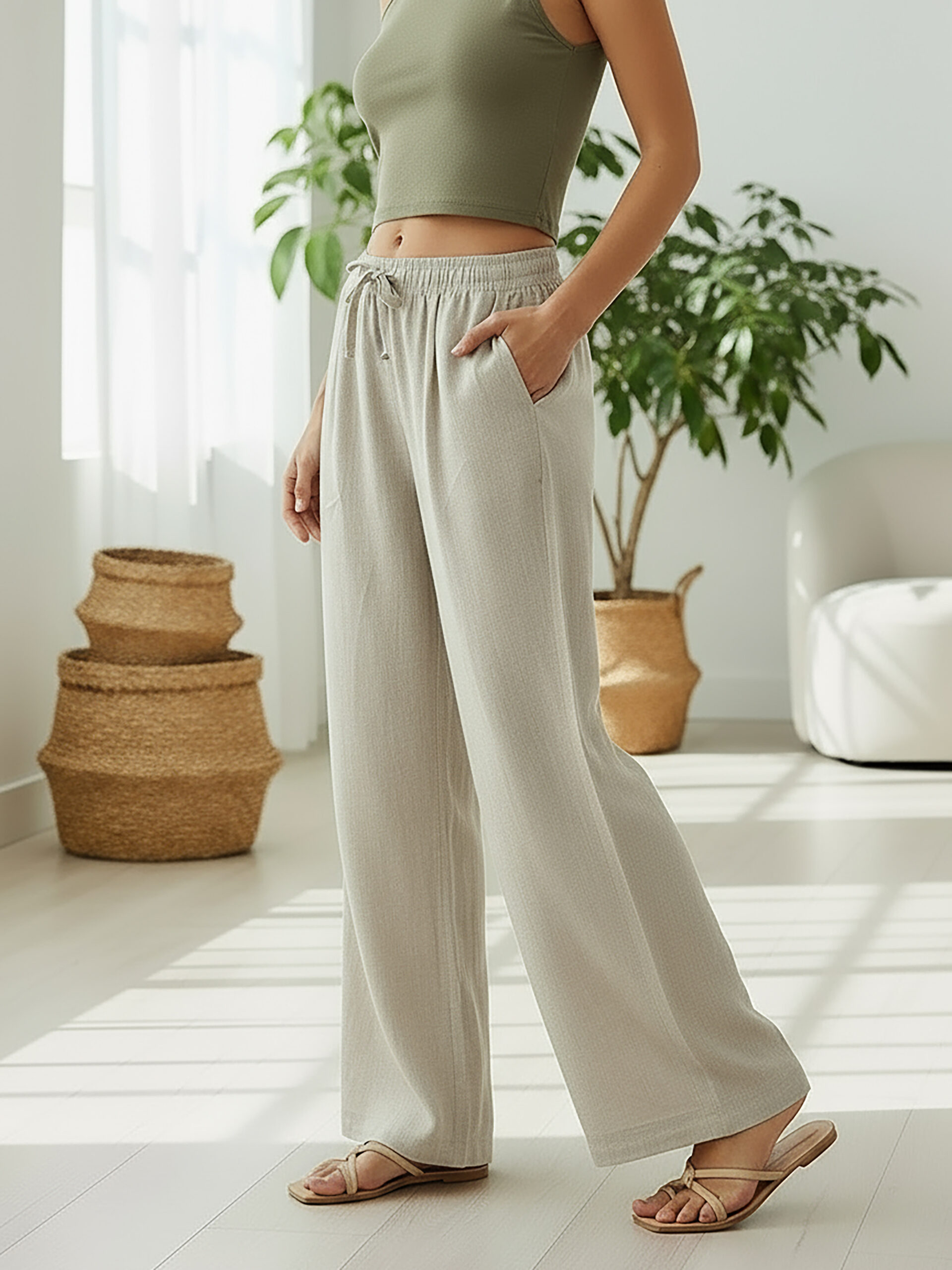 Представляем вам идеальные летние брюки, которые станут основой вашего гардероба! Созданные из 100% натурального белорусского льна с эффектом крэш, они дарят ощущение невесомости и прохлады даже в самый знойный день. Высокая посадка на комфортной резинке и стильные завязки позволяют идеально отрегулировать их по талии, а мягкие складки на поясе добавляют элегантности.