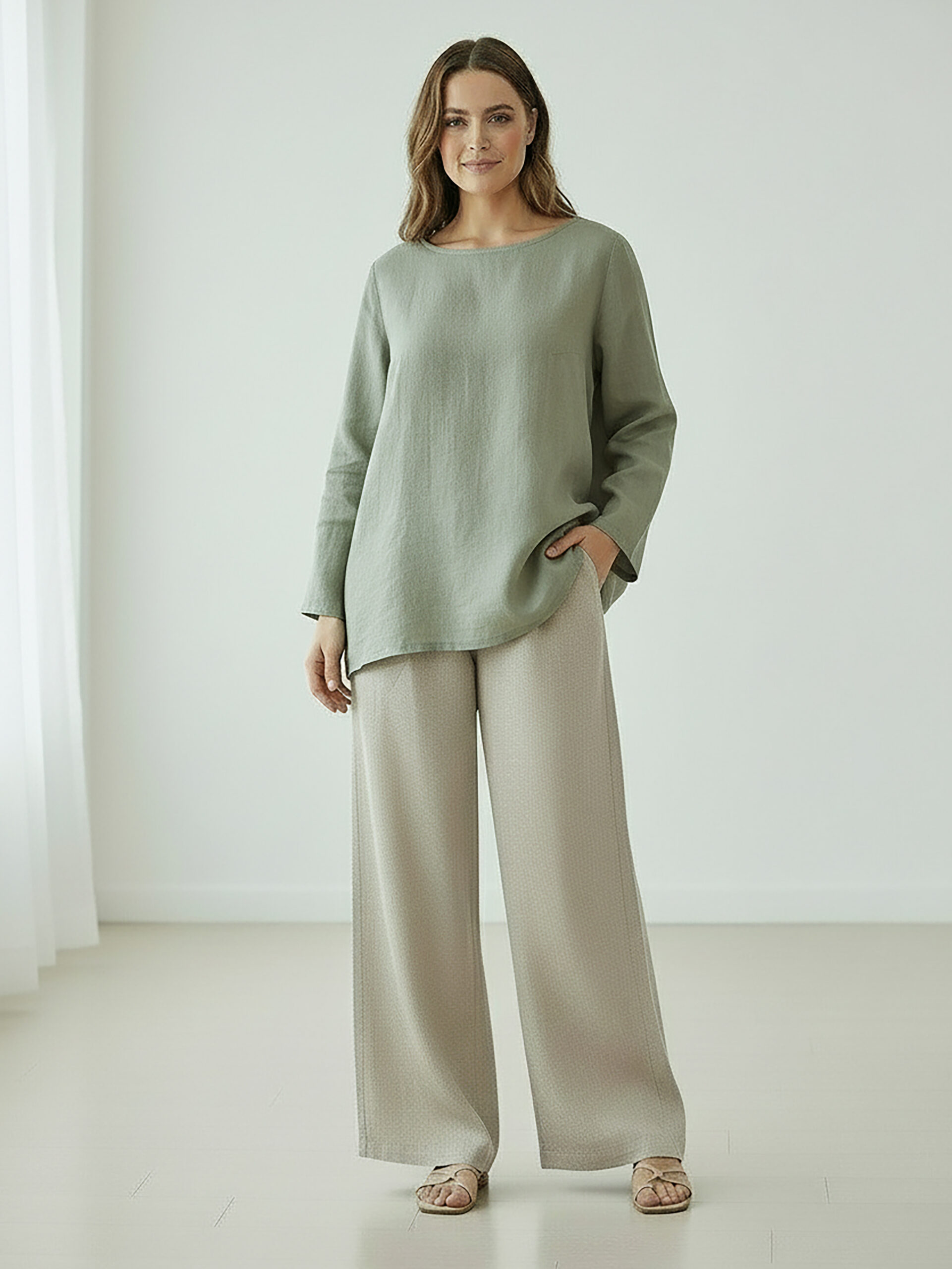 Натуральный лен – это дышащая, гипоаллергенная ткань, которая бережно относится к вашей коже, впитывает влагу и дарит ощущение свежести. Свободный крой дарит уверенность и комфорт в движении.