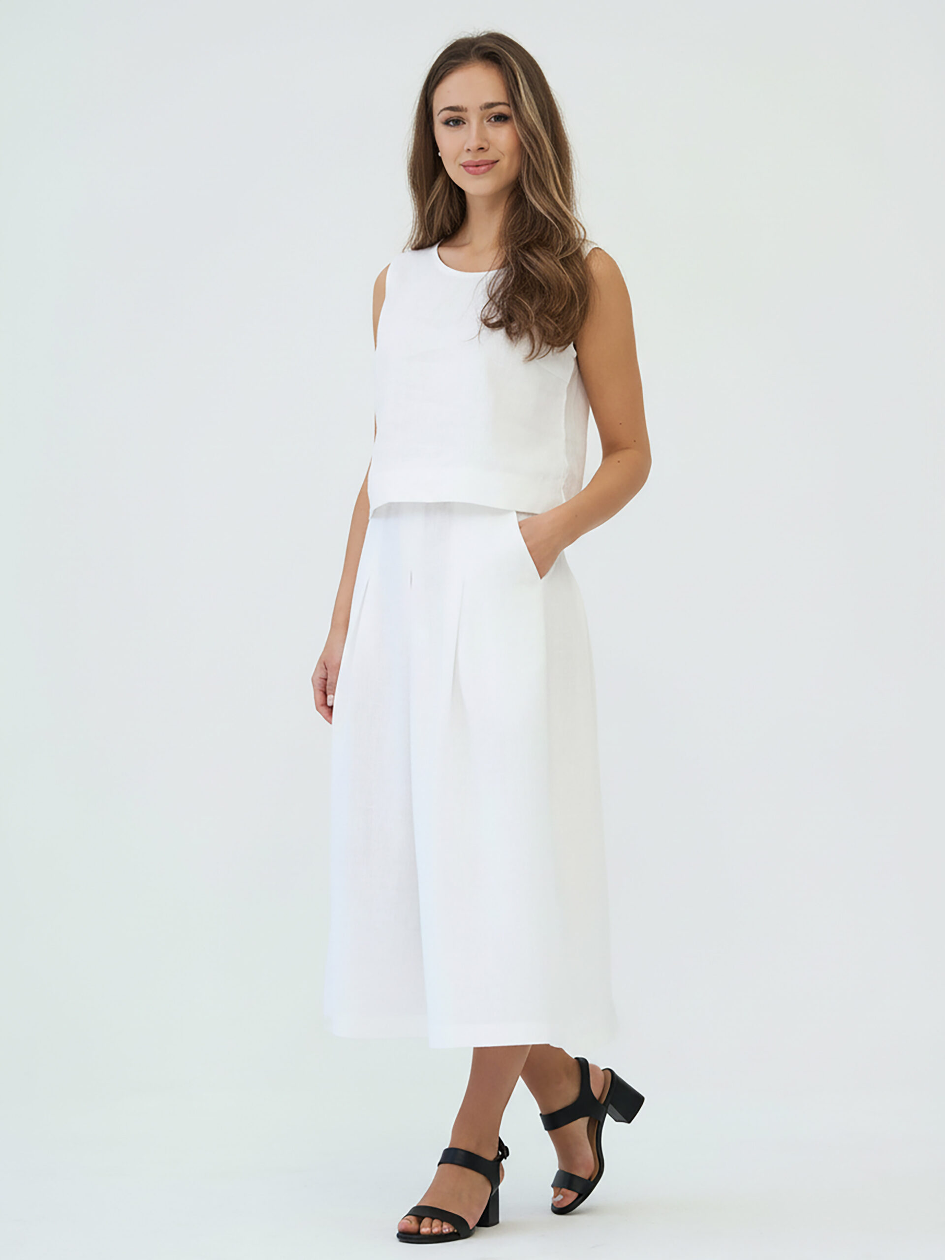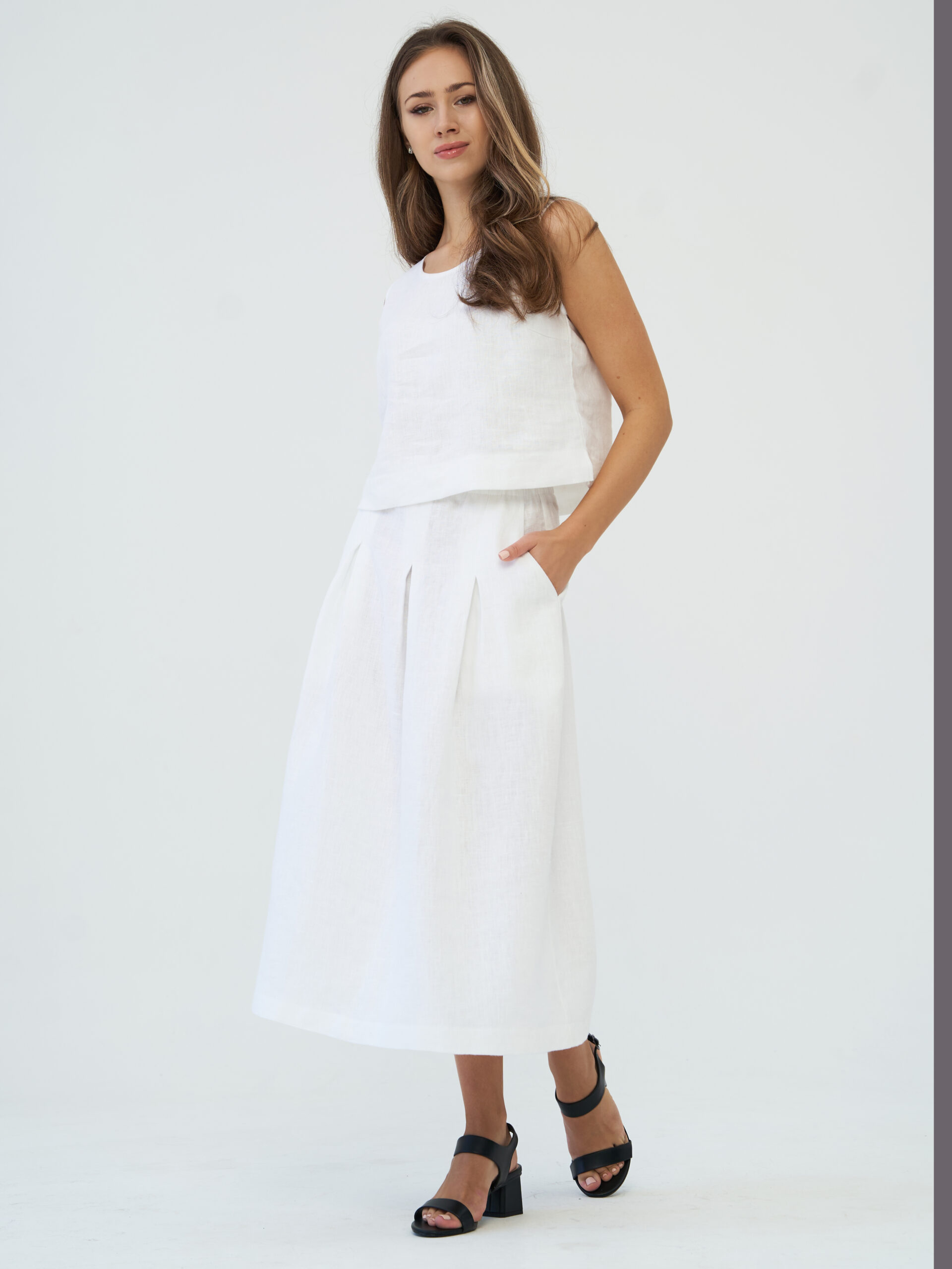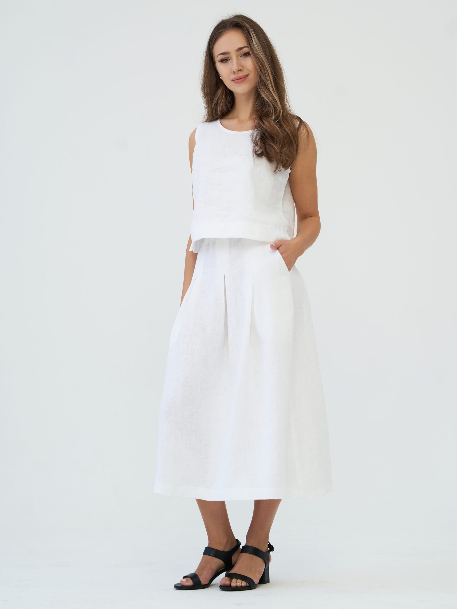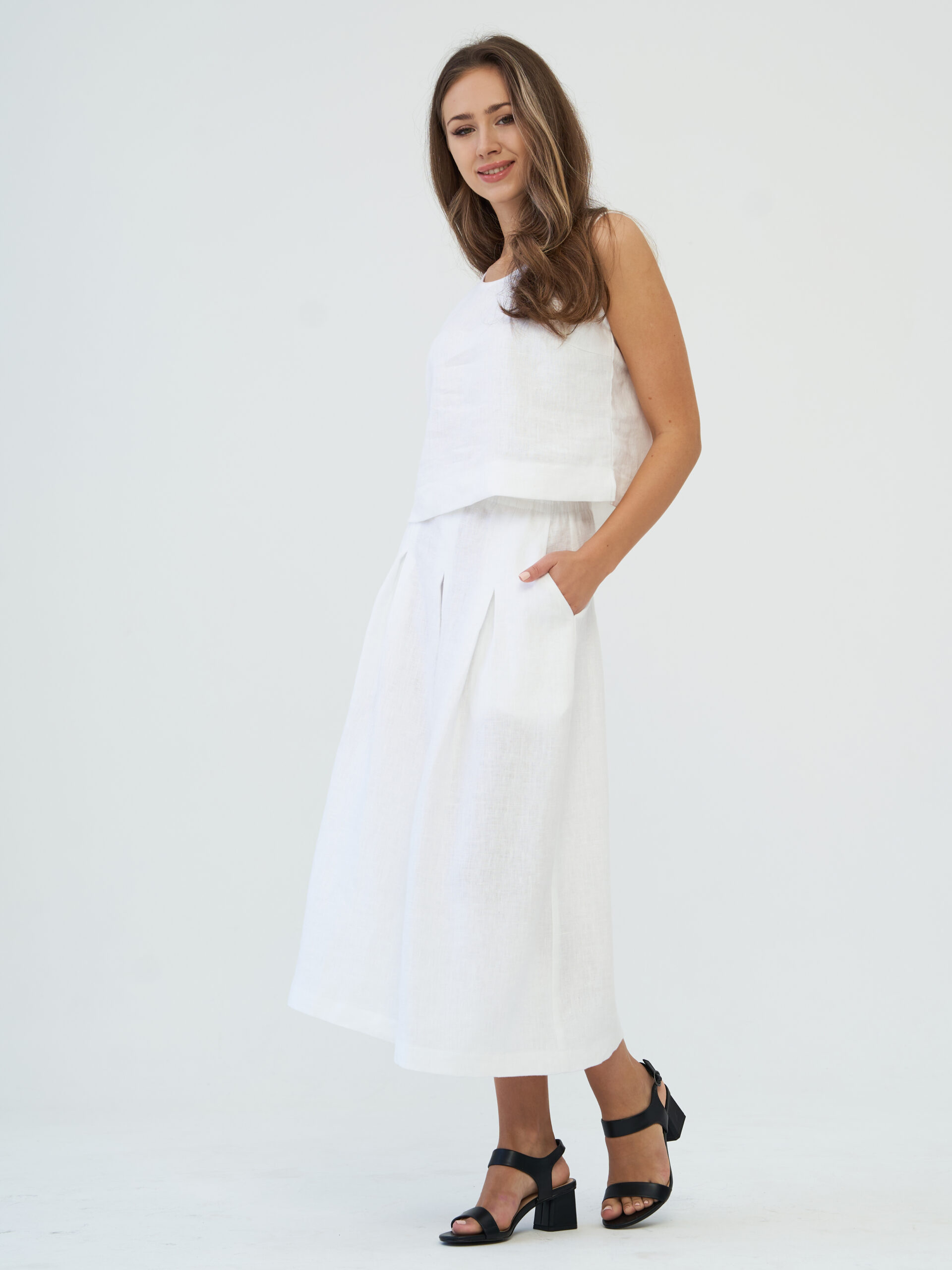 Универсальность льна позволяет легко комбинировать юбку с любыми топами и блузами. А вариант средней длины, дополненный удобными карманами, добавит не только практичности, но и изысканности вашему стилю, акцентируя внимание на вашей природной грации.
