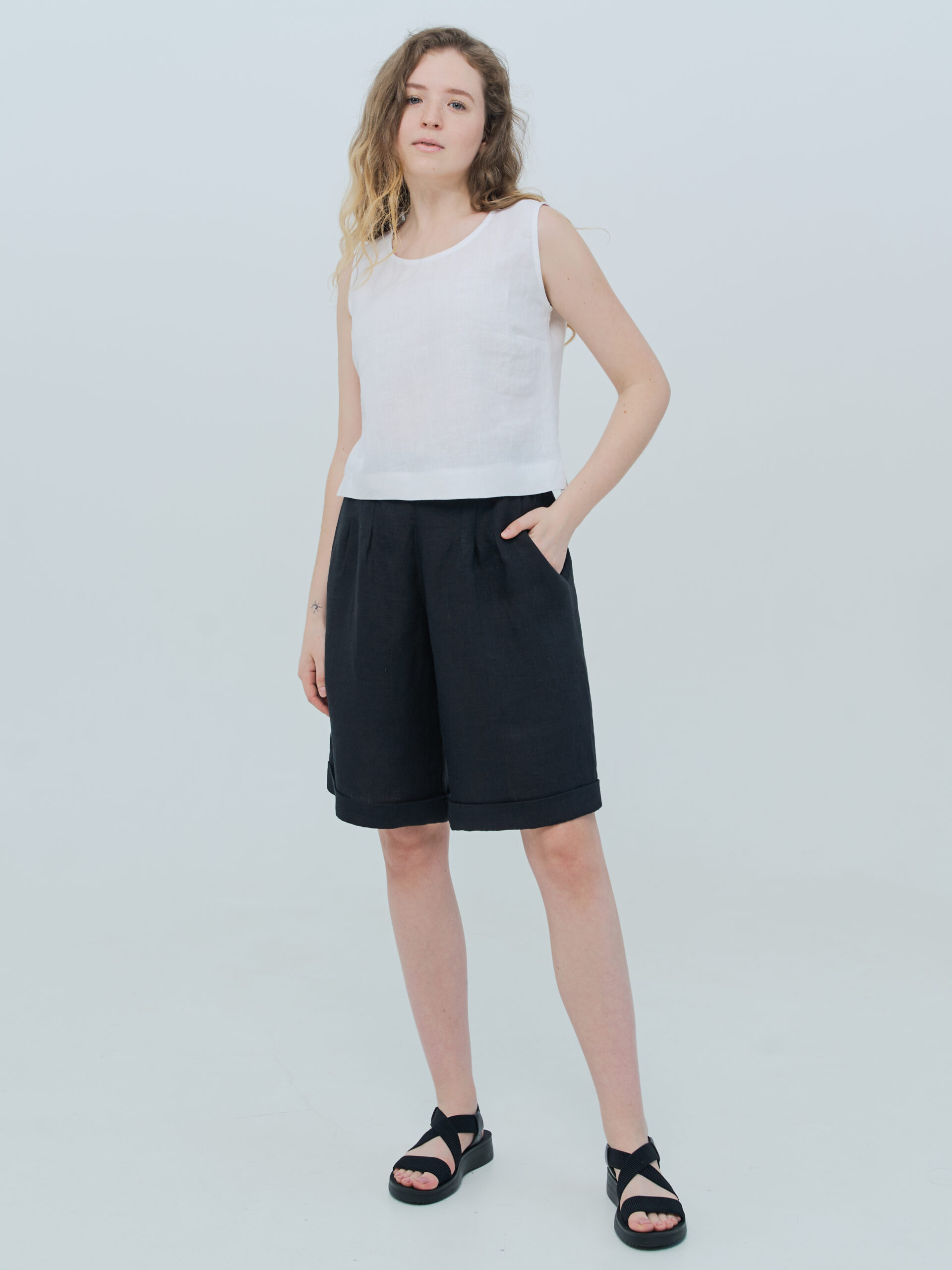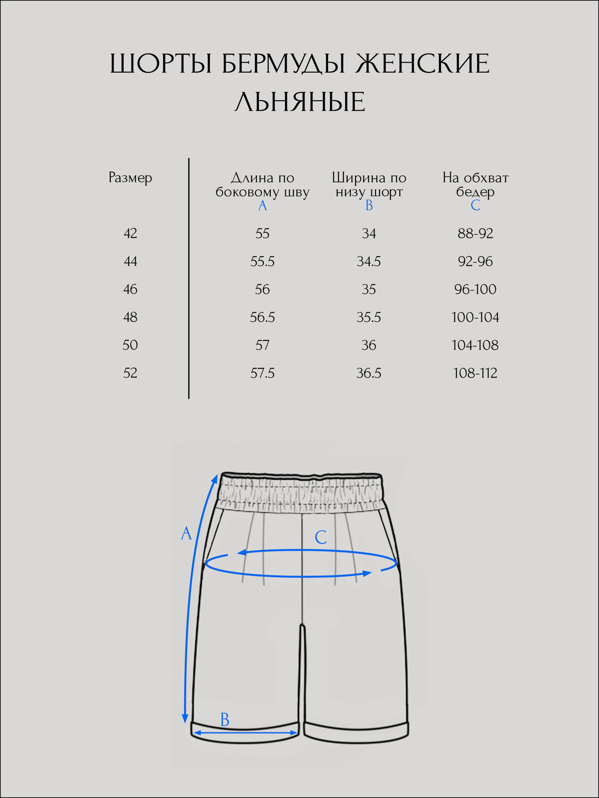 Льняные шорты -отличный выбор для теплого времени года. Этот стильный элемент гардероба сочетает комфорт и модные тенденции, подчеркивая красоту девушек и женщин. Бермуды выполнены из натурального льна, что обеспечивает приятное ощущение прохлады в жаркую погоду. Шорты с высокой талией идеально подходят для создания летнего образа как для пляжа, так и для прогулок у моря.Свободные бермуды обеспечивают свободу движений и создают эффектный силуэт. Шорты-бермуды – классический базовый вариант гардероба девушек и женщин старшего возраста. Стильные бермуды подходят женщинам разных возрастов благодаря своей универсальности. Плотная структура материала гарантирует долговечность изделия даже при частом ношении. Благодаря классическому дизайну такие шортики гармонично впишутся в любой гардероб, добавляя нотку летней моды к любому стилю. Широкий крой позволяет чувствовать себя комфортно даже в самые теплые дни лета, а материал из натурального льна поддерживает естественную вентиляцию кожи. Это практичный вариант одежды для девушек, которые ценят удобство без ущерба для внешнего вида. Такие свободные бермуды станут вашим любимым выбором не только для отпуска или путешествий к морю, но также и для домашних условий.